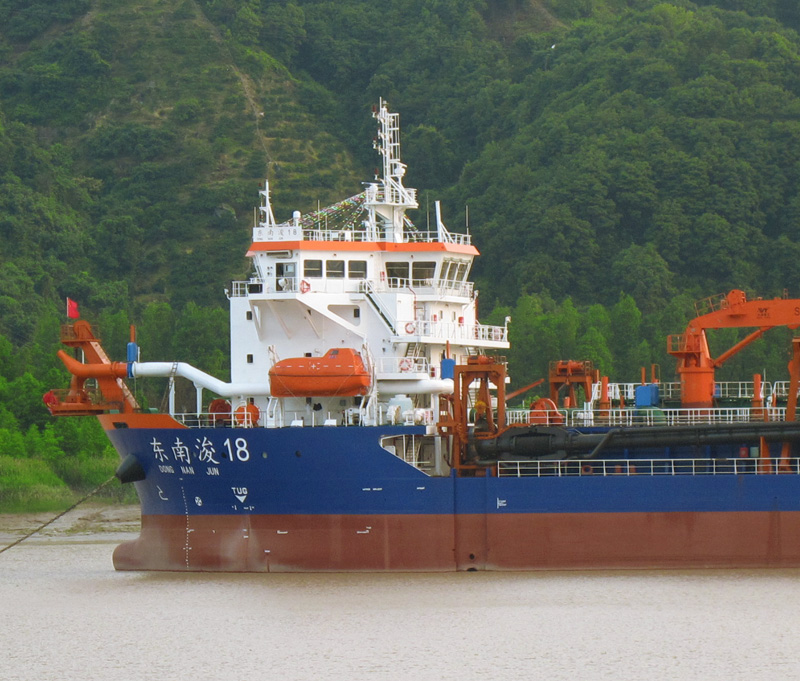 “东南浚18”轮是一艘全球无限航区带艏吹耙吸式挖泥船,该轮船长:117.1米,型宽:24米,型深:8米,总舱容:8658立方米。主机采用MAN9L32/40型两台,单机功率为4500KW,设计航速为15节。